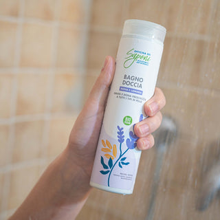 È un docciaschiuma che deterge la pelle senza seccarla, grazie ad un mix di oli bio vegetali, gel di Aloe ed estratto di Avena ed olio essenziale alla Lavanda.