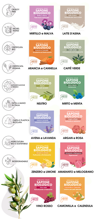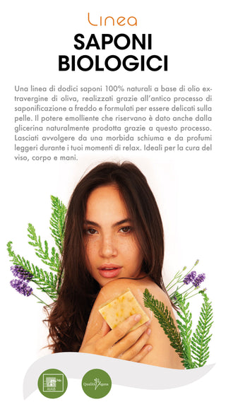 A base di olio extravergine d’oliva biologico, che con le sue proprietà nutrienti e restitutive, rende questo sapone ideale per tutti i tipi di pelle.