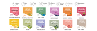 Un sapone coloratissimo, realizzato con i ritagli dei nostri dodici saponi che formano un mosaico vivace di verdi, rossi, e aranci.